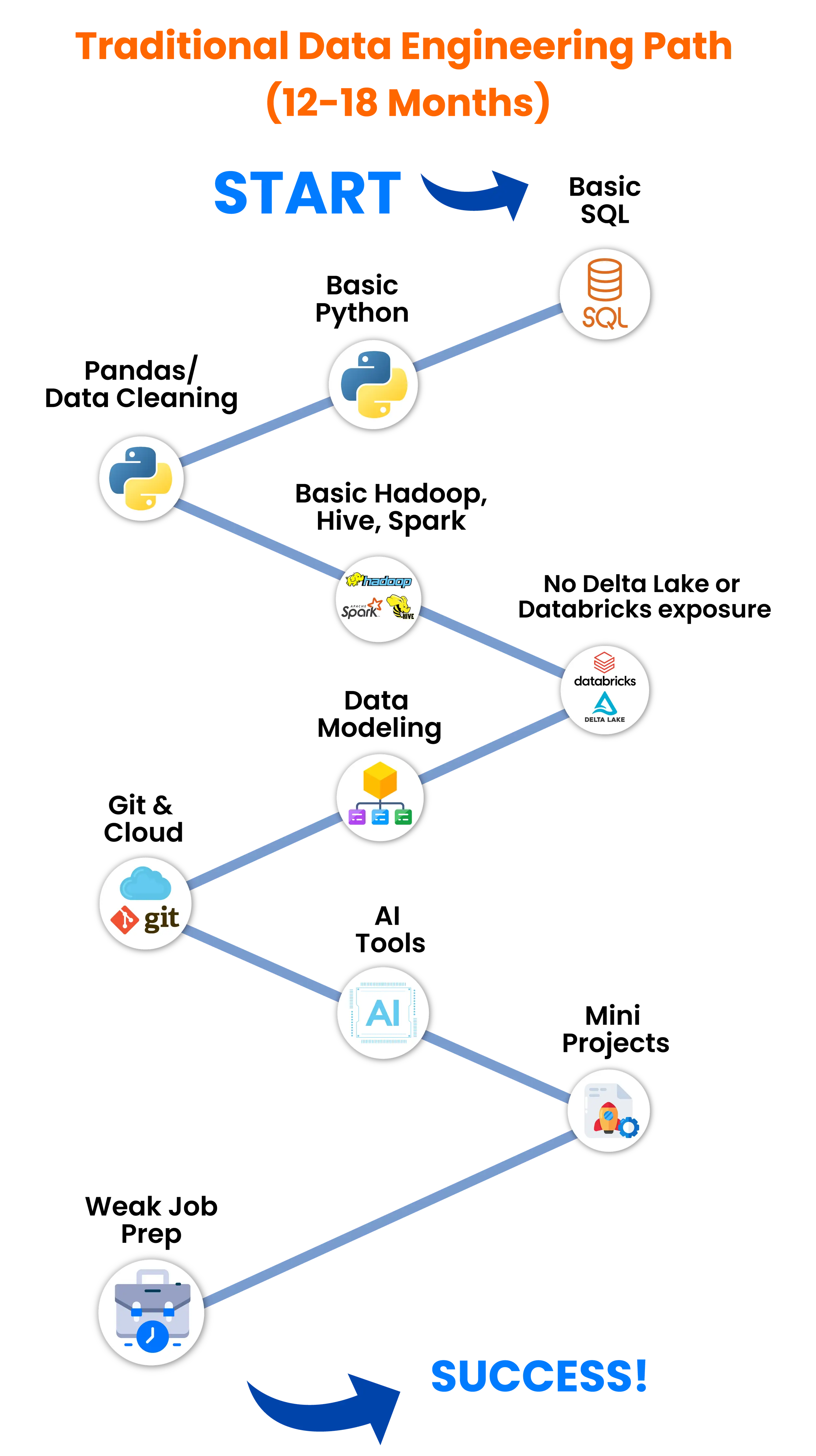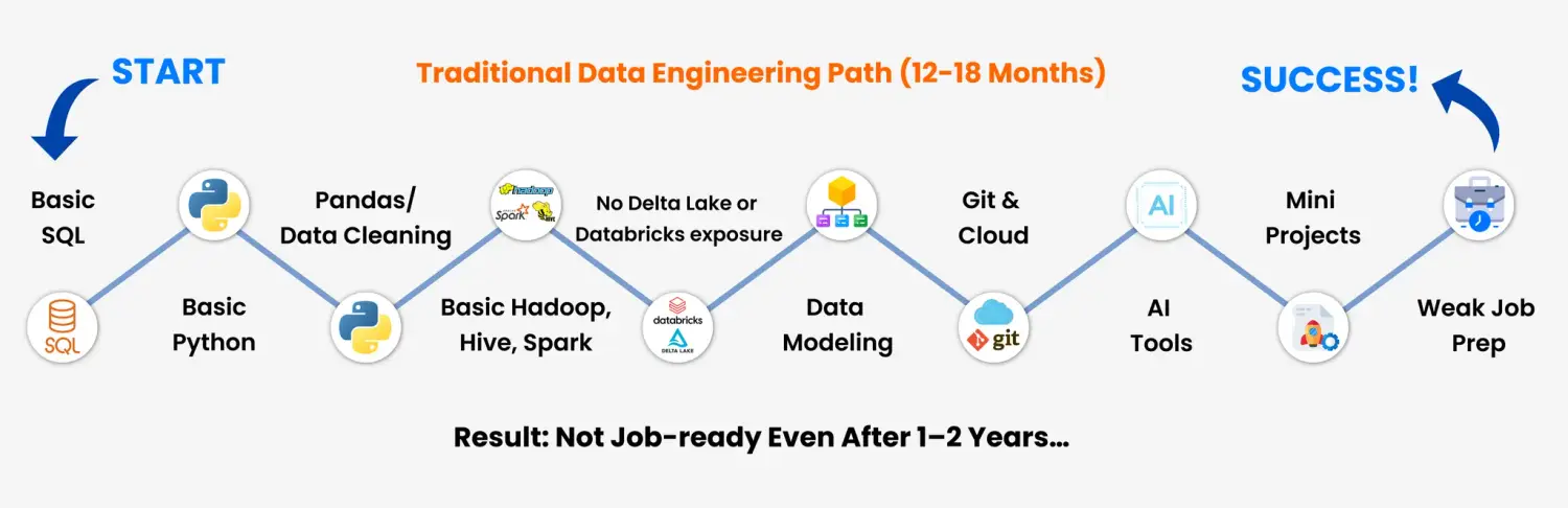 Not at all. We teach only what’s relevant for Data Engineering. No rabbit holes. You’ll build hands-on projects with tools like PySpark and Databricks that hiring managers actually care about.